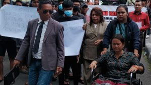 Medan, swatantranews- Julita Br Surbakti Korban dugaan malpraktik dengan menggunakan kursi roda dan massa Jaringan Pemuda dan Mahasiswa Deliserdang (JPMD) menggelar aksi unjuk rasa di depan Mapoldasu, Senin (24/3).