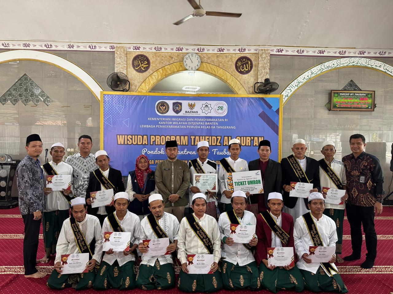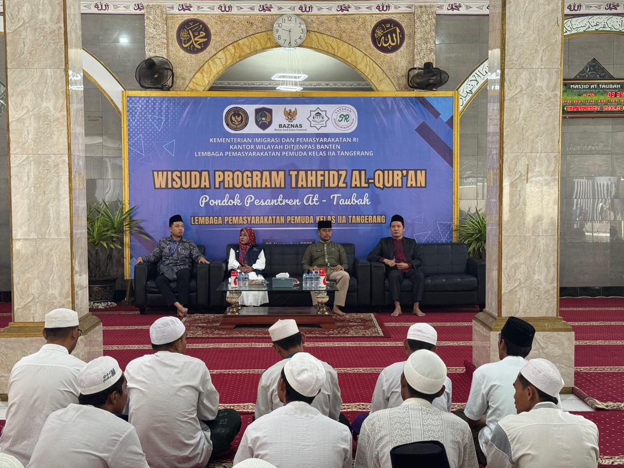Swatantranews- Kota Tangerang || Lapas Pemuda Kelas IIA Tangerang menyelenggarakan Wisuda Tahfidz Santri Warga Binaan Pondok Pesantren At-Taubah yang digelar di Masjid At-Taubah Lapas Pemuda Tangerang. Kegiatan ini merupakan bagian dari program pembinaan kepribadian berbasis keagamaan yang dilaksanakan melalui kerja sama antara Lapas Pemuda Tangerang dengan Yayasan Syakirah Ramadhan dan Yayasan Baiturrahman.