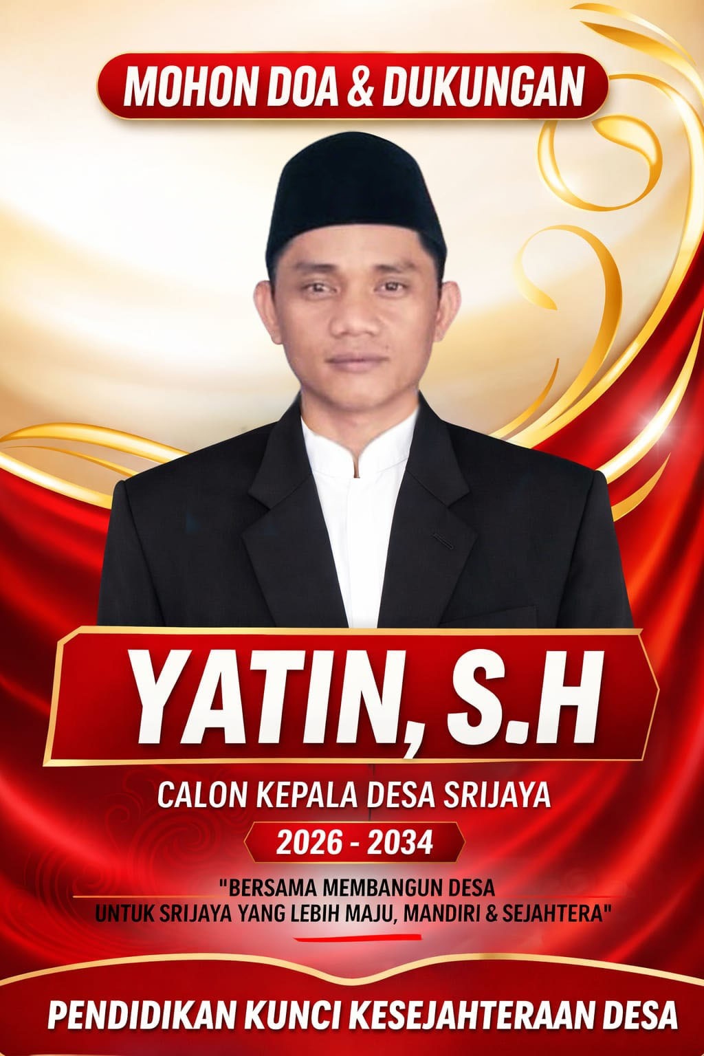 “Sebagai putra daerah, saya merasa memiliki tanggung jawab moral untuk berkontribusi secara nyata bagi kemajuan Desa Srijaya. Saya maju dalam kontestasi ini dengan tujuan utama untuk mengajak seluruh warga bahu-membahu membangun desa kita, sehingga kelak dapat menjadi wilayah yang lebih maju, mandiri, dan sejahtera,” ungkap Yatin.