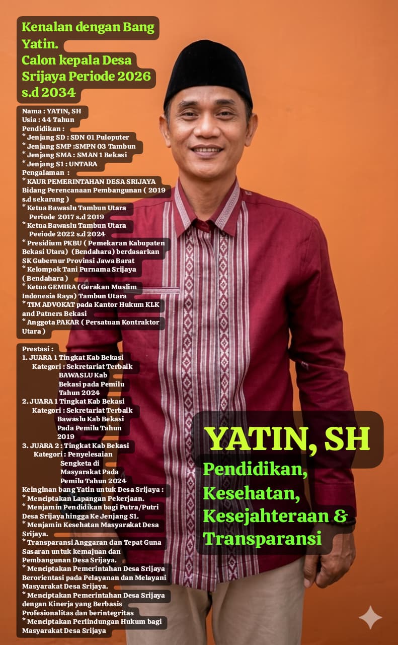 BEKASI SWATANTRANEWS – Semangat baru dalam kontestasi kepemimpinan Desa Srijaya kian terasa. Yatin, SH, sosok putra daerah yang memiliki rekam jejak pengabdian dan pengalaman panjang di bidang pemerintahan dan kemasyarakatan, resmi menyatakan kesiapannya untuk maju sebagai calon Kepala Desa Srijaya untuk periode masa jabatan 2026 hingga 2034.